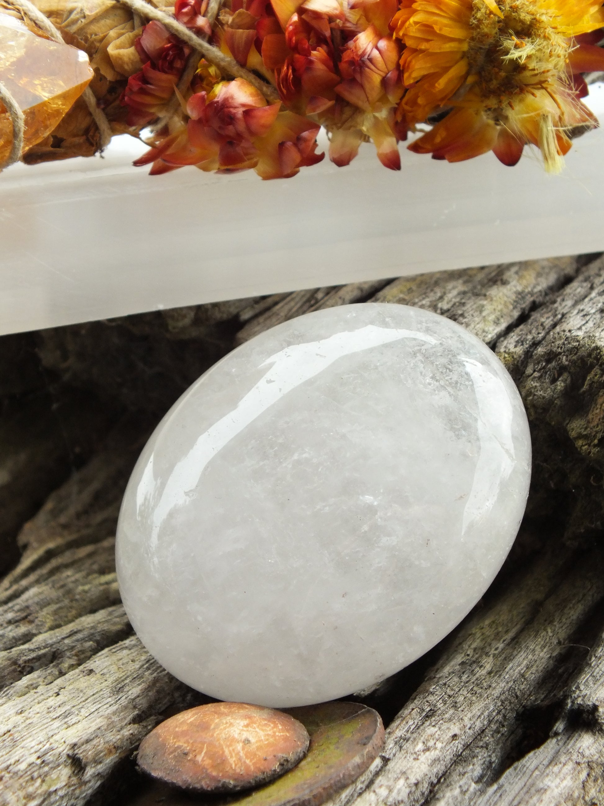 Clear Quartz Palm Stone channels radiant energy to illuminate the crown chakra, enhancing spiritual awareness and fostering a deeper connection to higher realms. This elegant stone not only rebalances your chakras but also promotes emotional stability by dispelling negative energy, inviting clarity and uplifting your mood with its pure, bright vibrations. Ideal for those seeking refined spiritual growth and emotional harmony.