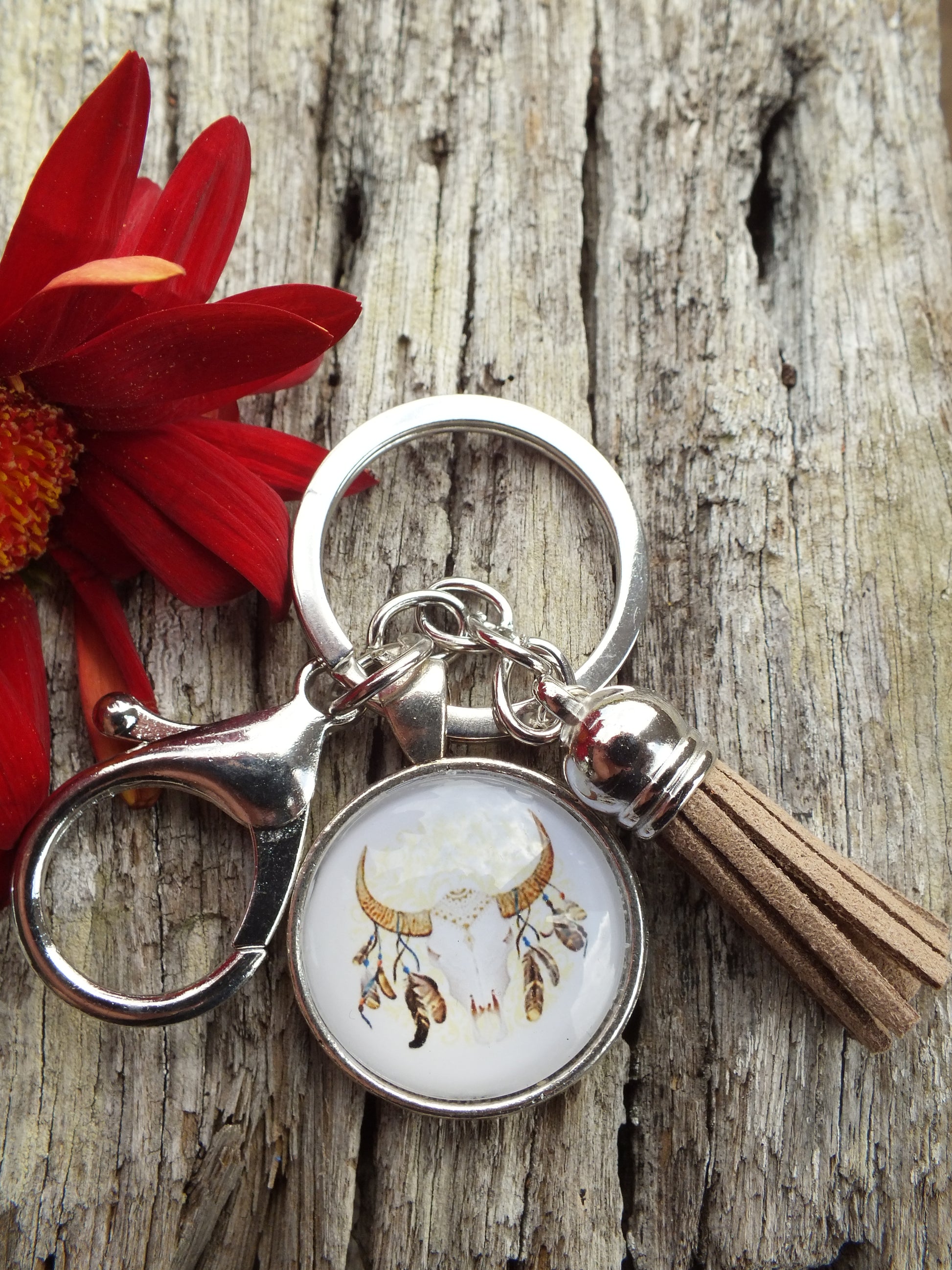 Featuring 25mm glass cabochon with Native American design inspired with leather tassel
