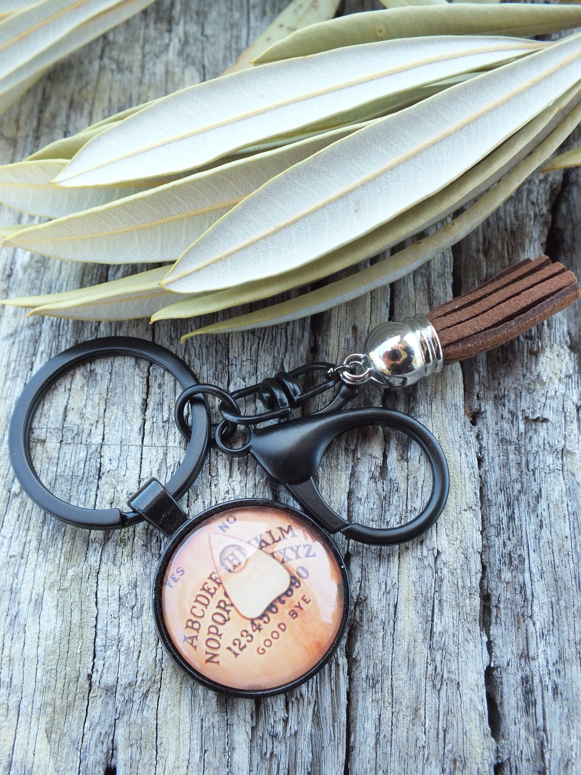 This Ouija Board Tassel Keyring is handmade at Onyx Castle, crafted with a Halloween-inspired black finish. Perfect for adding a touch of spooky style to your keys or bag.