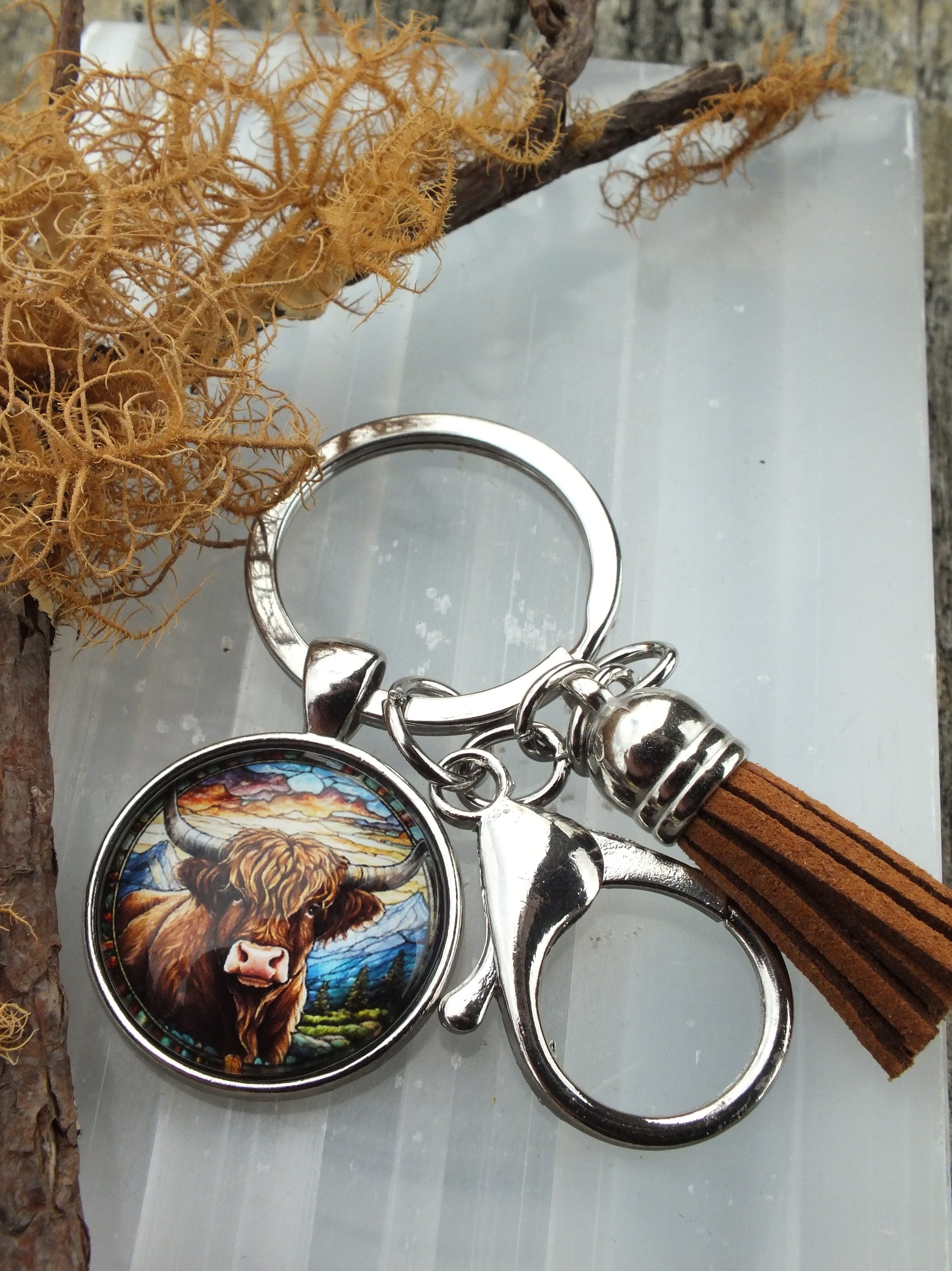 This handmade keyring features a stained glass style Highland cow cabochon, capturing the timeless appeal of Scottish Highland cattle. Perfect for adorning both keys and handbags, it combines artistic craftsmanship with a sophisticated touch, making it a distinctive accessory for everyday use.